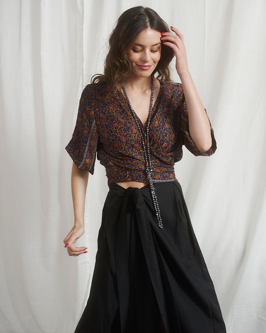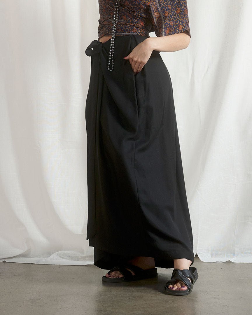 Falda maxi a la cintura, muy suave y combinable. Falda envolvente que se ajusta mediante un lazo