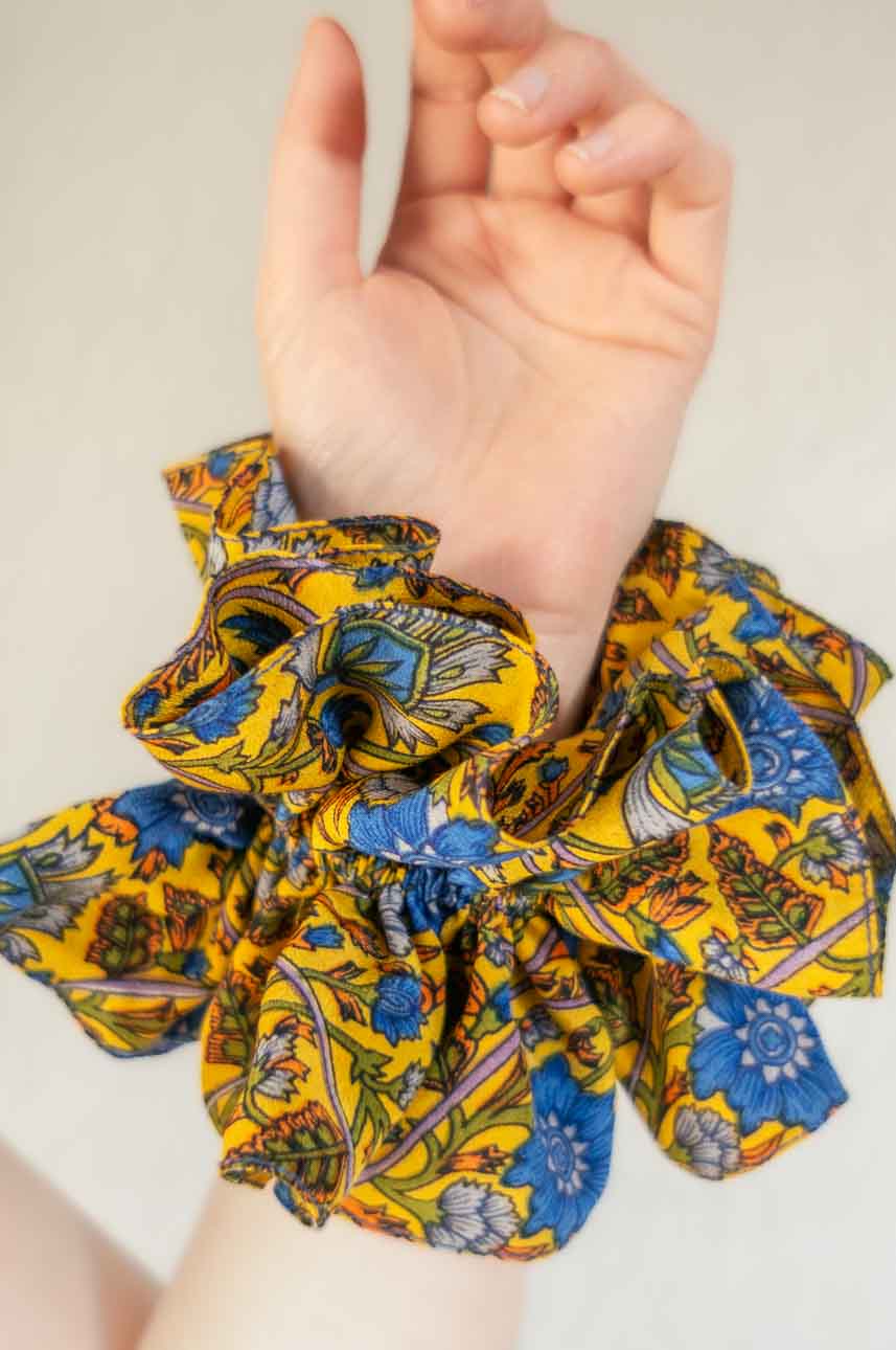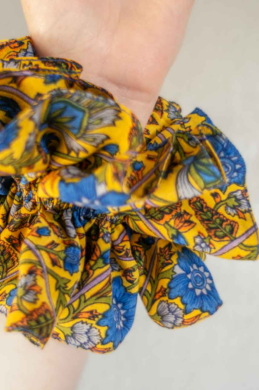 Es un colet respetuoso con tu pelo y con la Tierra. Un maxi scrunchie que te anima, te tira para arriba. Muy indicada si un día te falta sunshine.