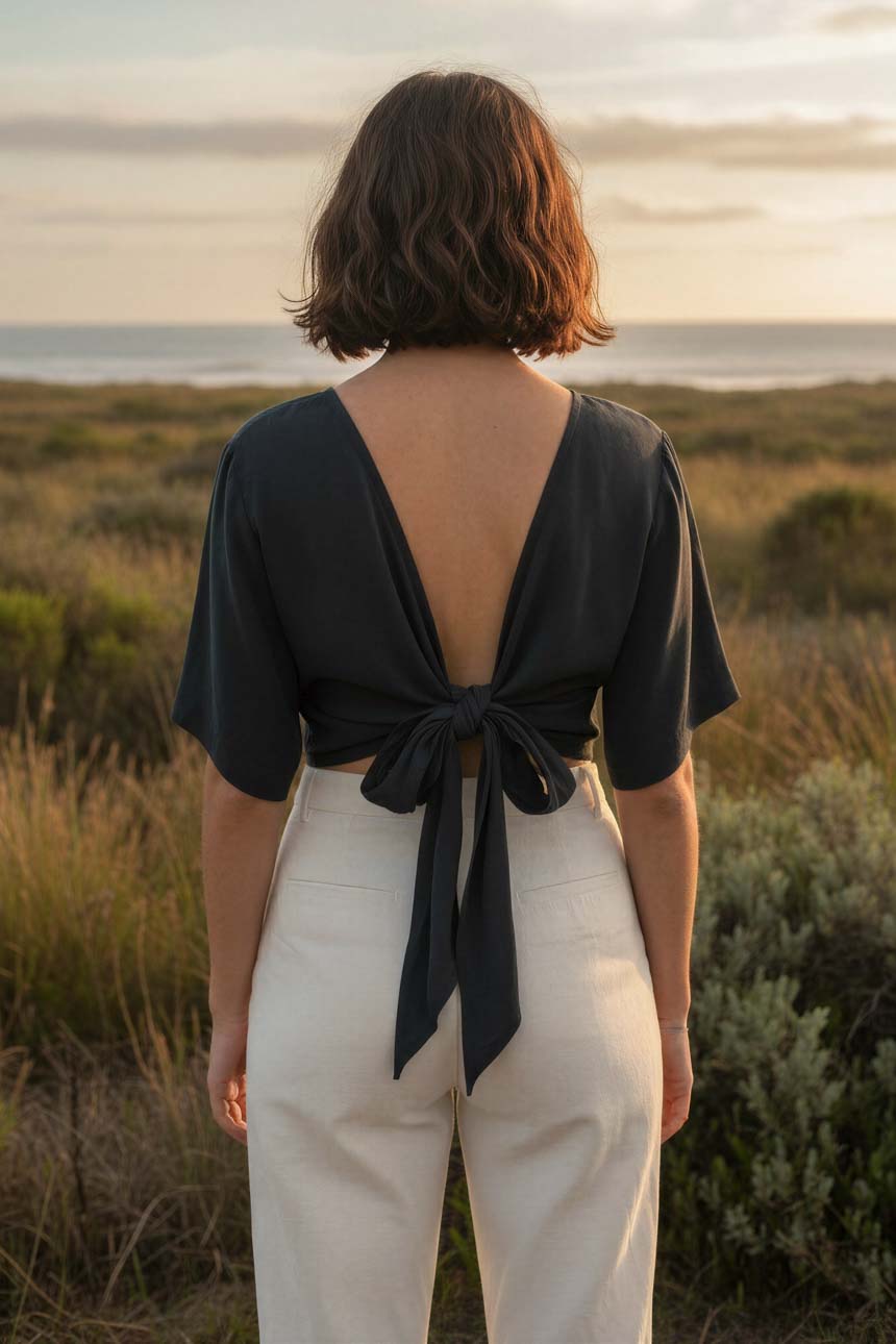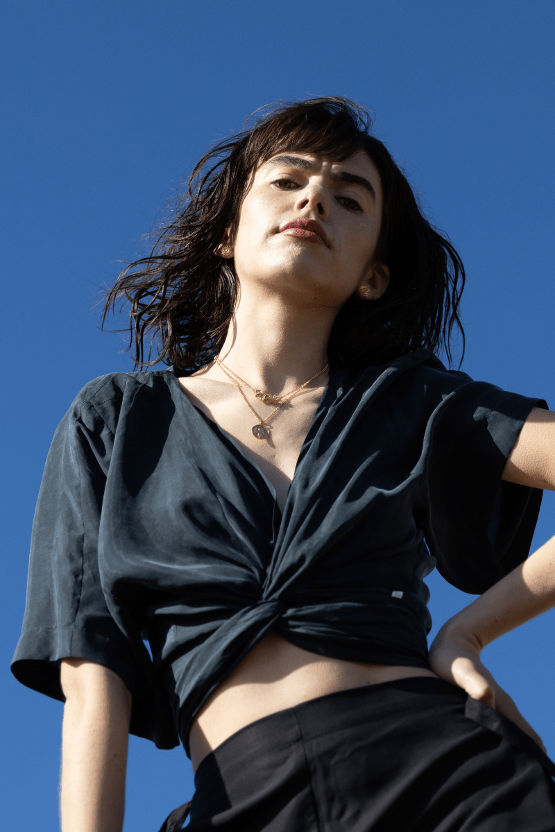 Top multiforma que permite usarlo de + 10 distintas maneras diferentes. De caída fluida, se adapta al cuerpo como un nudo al viento: puede usarse cruzado, anudado o suelto.
