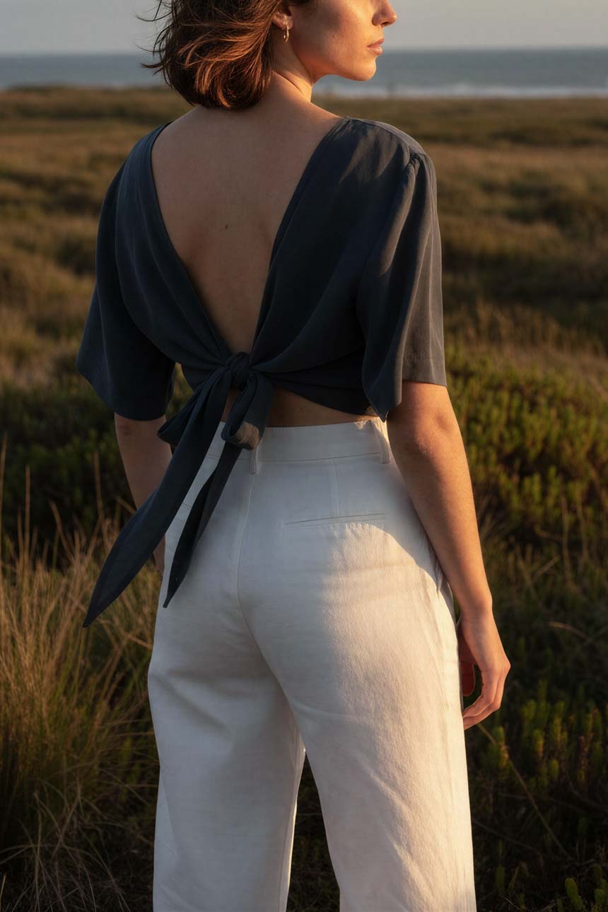 La colección celebra la belleza de lo móvil y adaptable, como en los movimientos sutiles de cada día. Cada diseño nace desde lo sensorial: el gesto de anudar con las manos, de sentir cómo la tela se desliza y responde al cuerpo, como una vela que se amarra y se deja guiar por el viento. Hecha con fibras naturales que se sienten suaves sobre la piel y le permiten respirar, cada pieza honra el trabajo artesanal y el tiempo de lo hecho con dedicación. Amarra es también ese instante al llegar a puerto: encontrar ese lugar seguro, donde descubres la comodidad y el relajo que acompañan cada versión de ti.